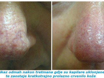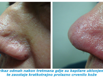Obično se radi o prolaznom crvenilu kože koje se brzo povlači. Ožiljci su praktički zanemariva opasnost. Može se eventualno dogoditi, ako su veće kapilare ili vene blizu površine kože, da se razvije manja krasta ili sitno oštećenje na koži. Rijetko se nakon tretmana može dogoditi naticanje, žarenje ili pečenje tretiranog dijela ili lica. U tom se slučaju odmah javite liječniku. Problemi se injekcijom za čas uklone. Moguće su manje modrice kod uklanjanja sitnih kapilara koje prolaze same za nekoliko dana.